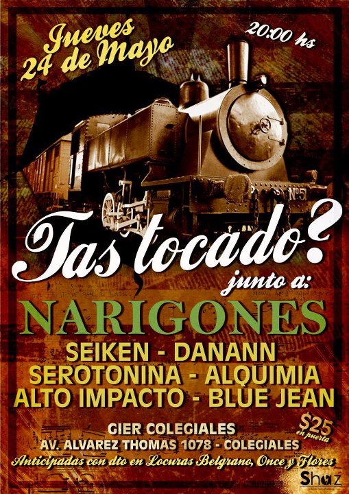 Alquimia en vivo el jueves 24 de mayo a partir de las 20:00hs en Gier Music (Av. Alvarez Thomas 1078, Colegiales, Capital Federal) junto a Narigones, Tas tocado?, Serotonina, Seiken, Danann, Alto Impacto y Blue Jean.